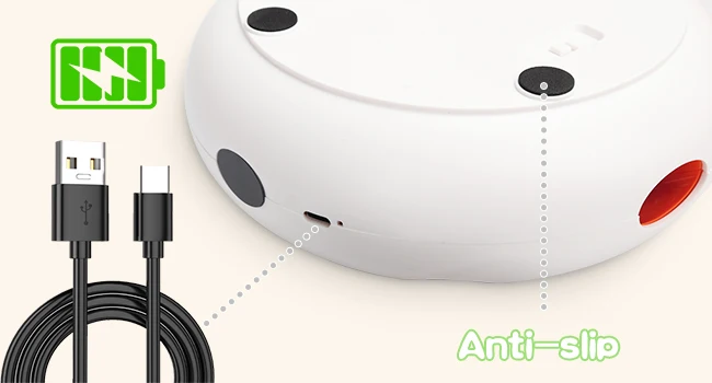 A bateria interna recarregável permite que os gatos brinquem por cerca de 0,5 hora/dia por 7 dias. Seria uma ótima economia para os usuários comprarem uma bateria extra para as brincadeiras diárias dos gatos. O LED vermelho aceso indica que o dispositivo está carregando, o LED apagado indica que a carga está completa.