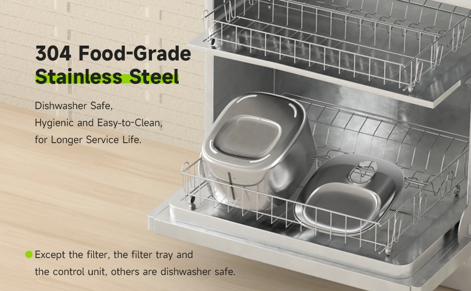 Tanto o corpo principal quanto a bandeja de água, bem como o aço do filtro, vão diretamente para a lava-louças, facilitando a limpeza.